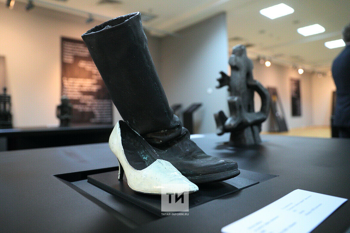 Самый неожиданный экспонат выставки — скульптура «Дань времени». Это старый мужской сапог и женская белая туфелька в натуральную величину, прислоненные друг к другу и визуально кажущиеся абсолютно текстильными предметами. Однако эта работа отлита из меди.