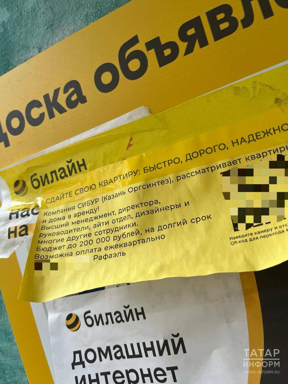 Как рассказали «Татар-информу» очевидцы, мошенники развешивают объявления возле подъездов многоэтажных домов, сообщая, что ищут жилье для размещения работников своей компании. Для привлечения внимания предлагается высокая ставка аренды — до 200 тысяч рублей в месяц.
