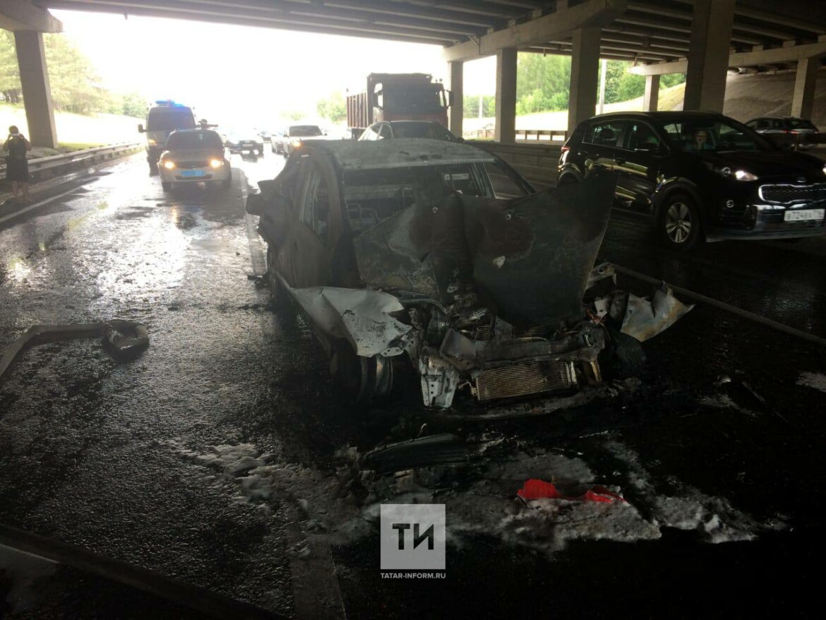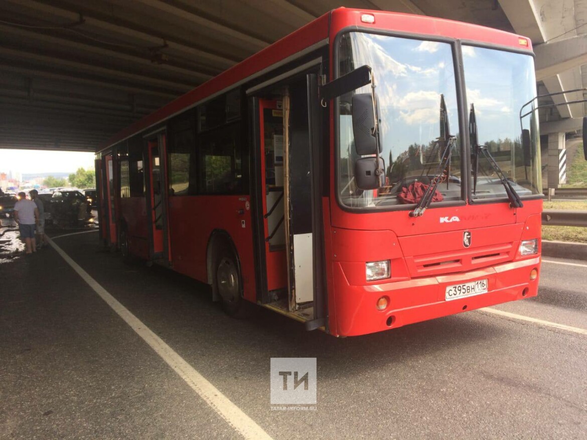Столкновение произошло сегодня днем под мостом на Мамадышском тракте. Водитель Renault влетел в автобус, от удара автомобиль загорелся. На место выехали пожарные и потушили огонь. Водитель легковушки, а также пассажиры и водитель автобуса не пострадали.