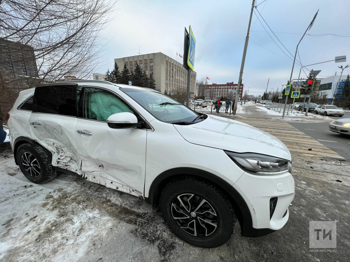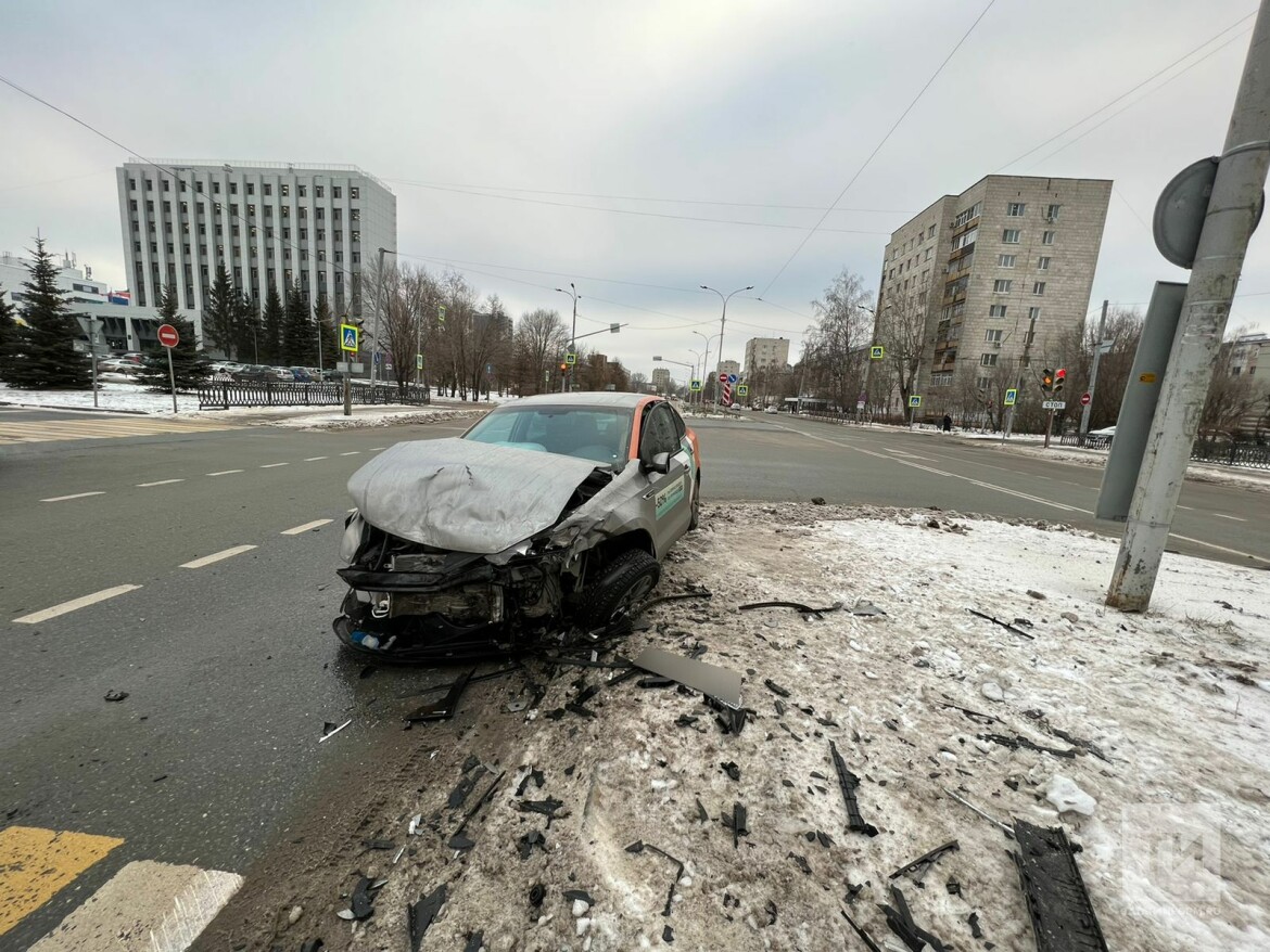 В Казани автомобиль выкинуло на тротуар после столкновения с каршерингом на перекрестке