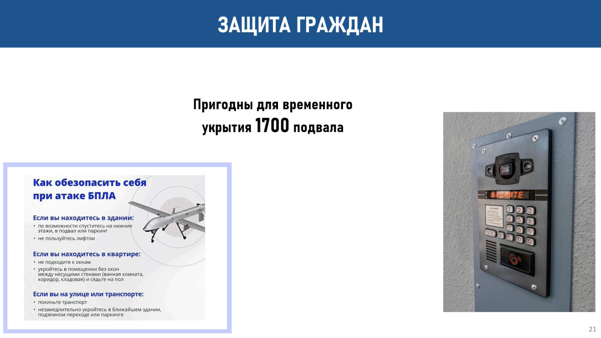 «В этом году очень остро встала задача создания условий для защиты граждан от угрозы воздушных атак. С этой целью в городе проведена ревизия подвальных помещений в многоквартирных домах. Определены как пригодные для временного укрытия 1,7 тыс. подвалов. В них силами управляющих организаций создаются необходимые условия для временного пребывания граждан», – отметил Гиниятуллин.