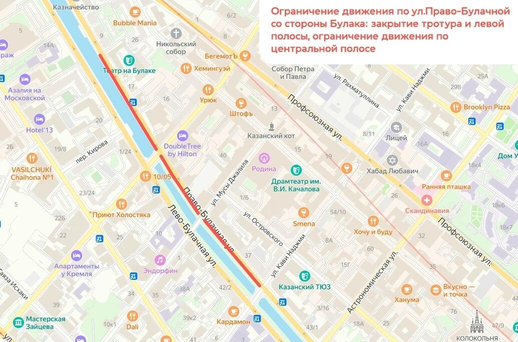 В Казани с 10 июня по 31 августа ограничат движение по Право-Булачной улице. Одна полоса будет перекрыта полностью, а вторая будет перекрываться по мере необходимости для установки тяжелой техники. Об этом сообщил заместитель руководителя исполкома Казани Искандер Гиниятуллин.