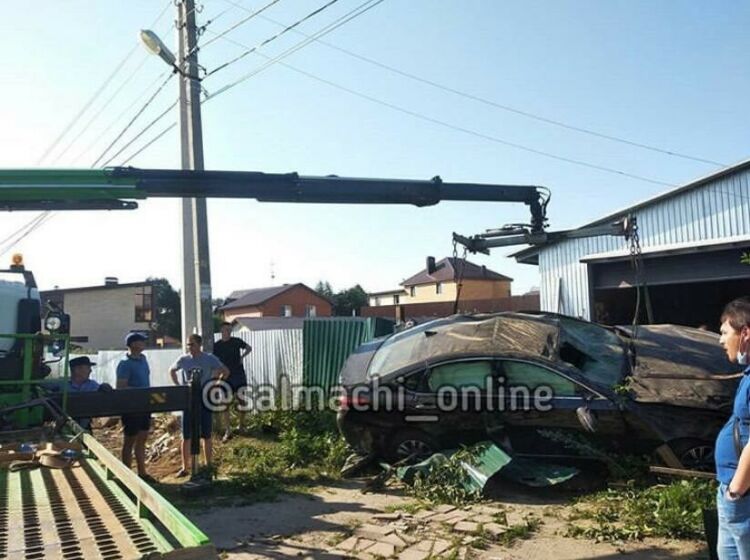 По словам очевидцев, автомобиль «Хендэ» на высокой скорости не вписался в поворот, подлетел, как на трамплине на куче щебня, проехал по крыше припаркованной машины и влетел в гараж частного дома.