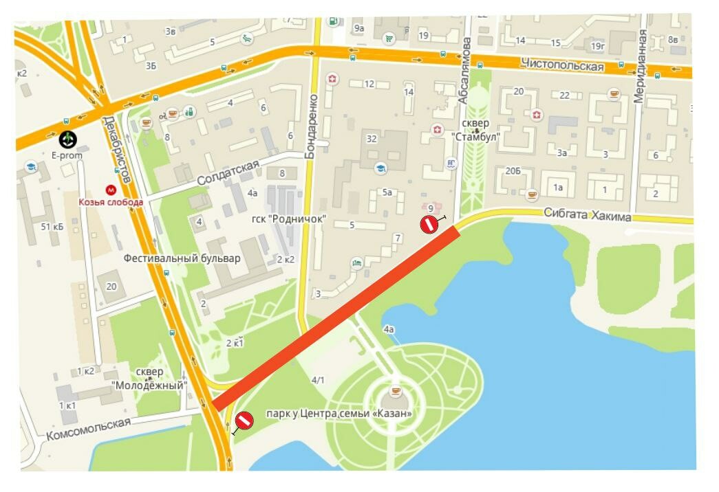 Отмечается, что для движения автомобилей будет перекрыт участок от улицы Декабристов до улицы Абсалямова. Ограничительный режим будет действовать 12 (с 15.00 до 23.00) и 14 июня (с 12:00 до 23:00).