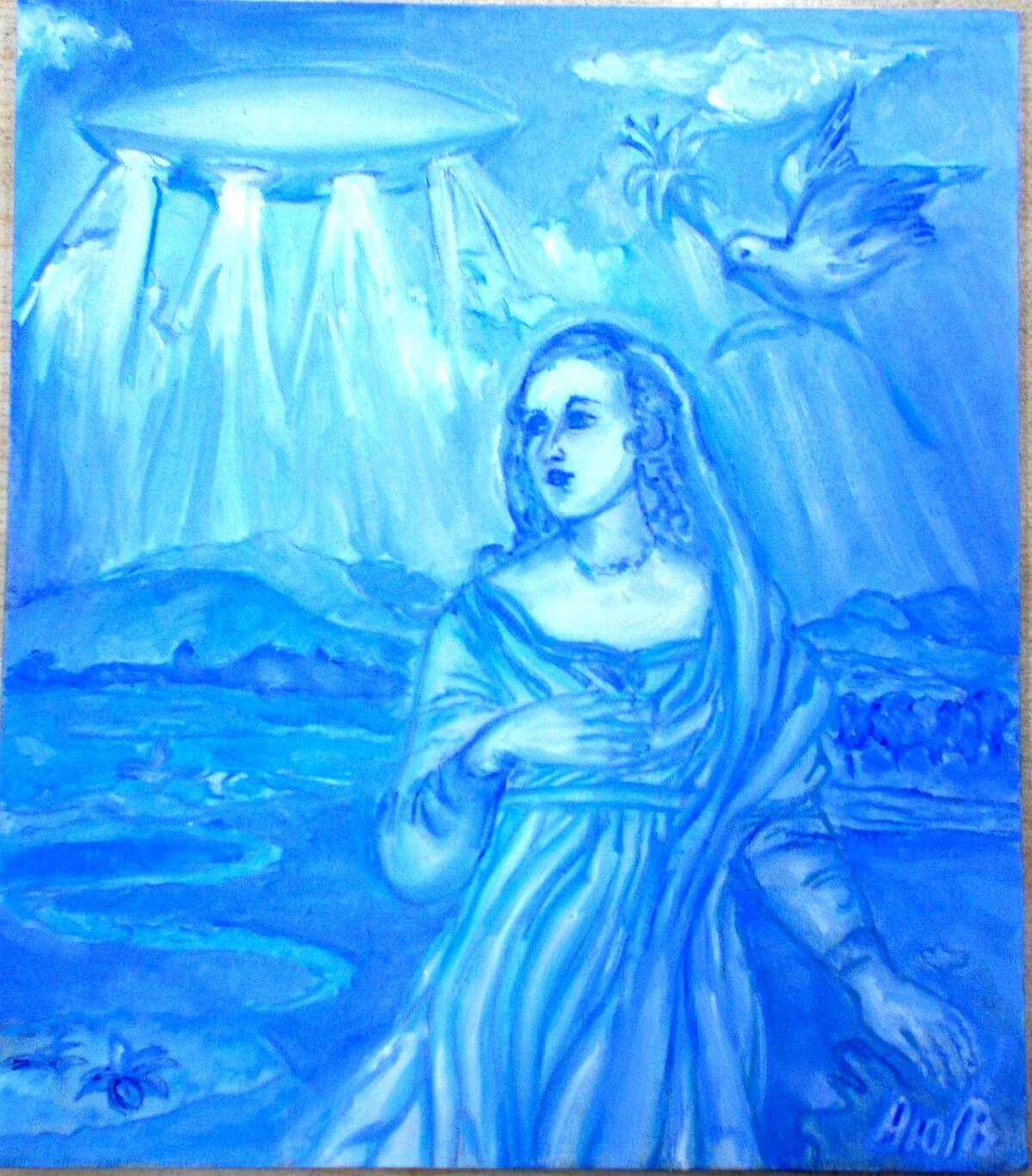 Автобиографическую работу представит Марина Абрамова. В произведении Лады Аюдаг среди облаков появляется фантастический сюжет с летающей тарелкой и голубем, несущим благую весть Мадонне Рафаэля.