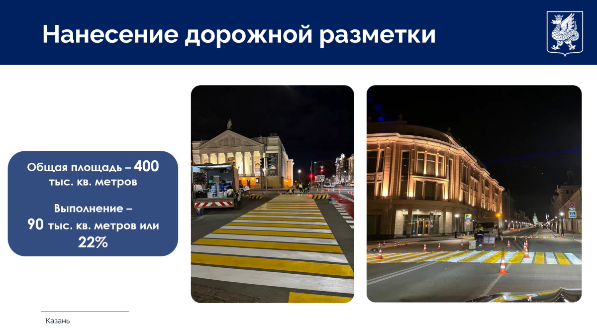По его словам, на сегодняшний день разметка уже нанесена на площади 90 тыс. кв. метров, что составляет 22% от запланированных 400 тыс. Работы ведутся с использованием термопластика на улицах с высокой транспортной нагрузкой и краски – на менее загруженных участках.