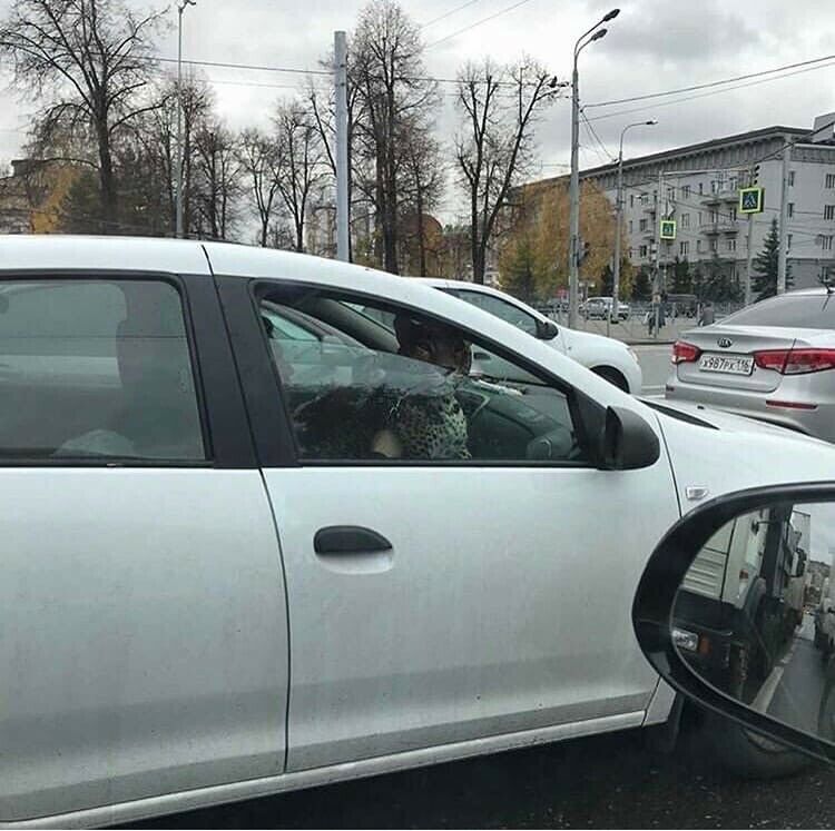 В Казани на фото сняли ягуара, сидящего на переднем сиденье авто