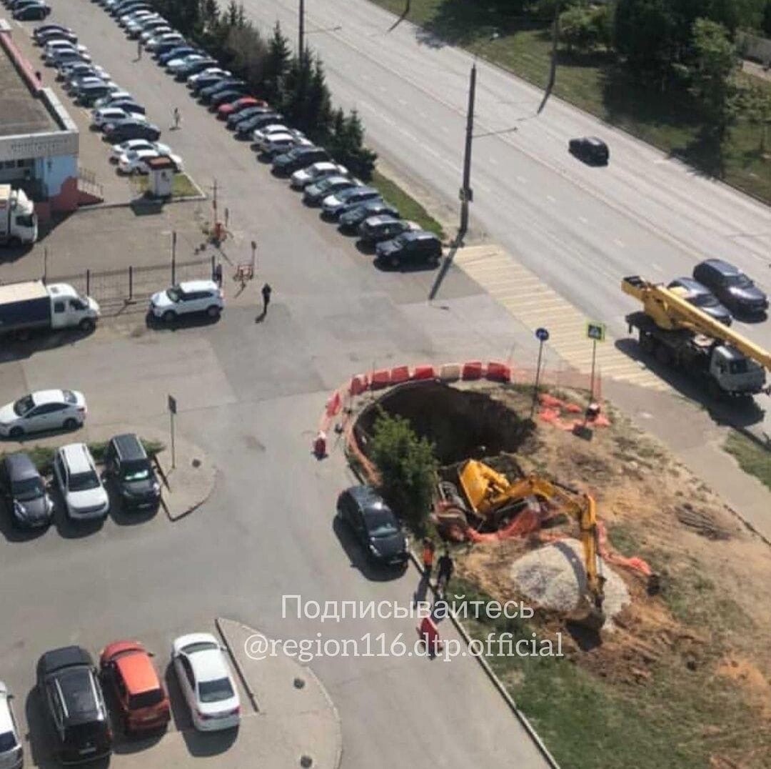 В социальных сетях появилось фото, на котором видно, как около пересечения улиц Фучика и Вербная экскаватор провалился в большую яму.
