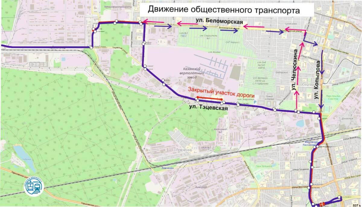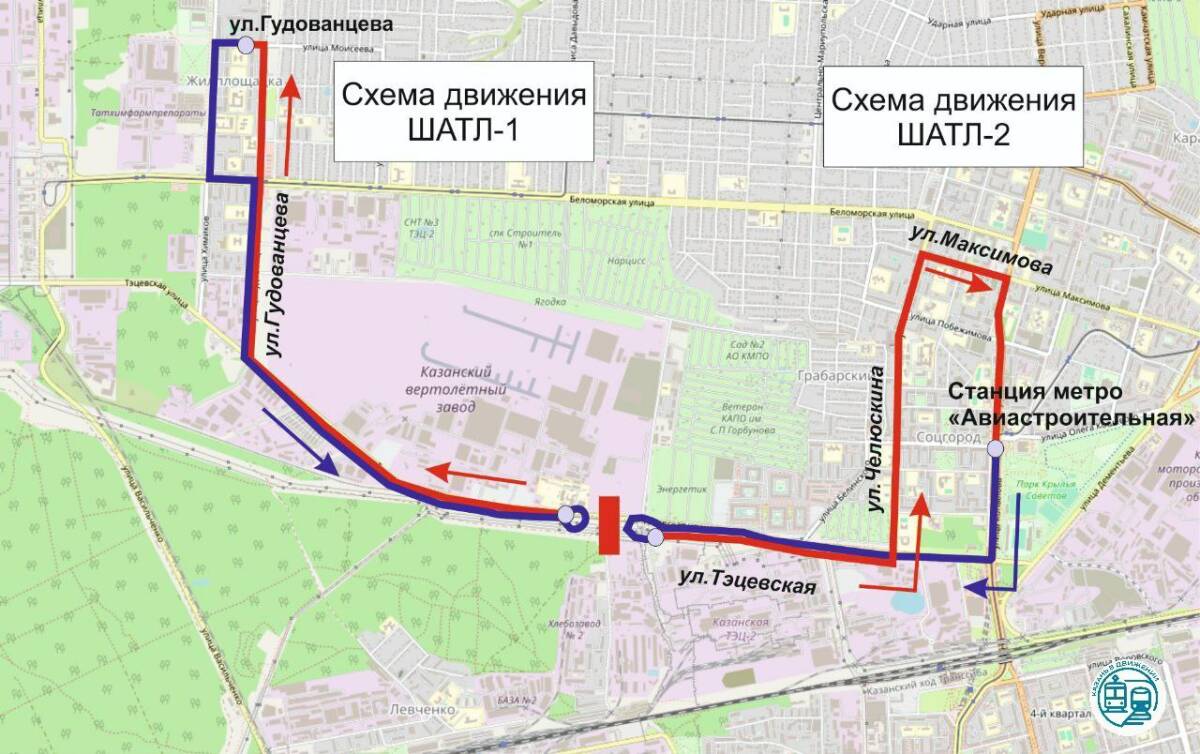 Для работников Казанского вертолетного завода и всех желающих в период перекрытия улицы Тэцевская будет организован подвоз двумя автобусами-шаттлами по маршрутам: