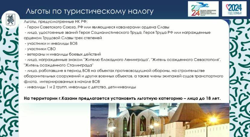 Также спикер сказал, кого освободят от сбора. На льготу могут рассчитывать Герои Советского Союза; Герои России; участники и инвалиды Великой Отечественной войны; ветераны и инвалиды боевых действий; инвалиды I и II групп, инвалиды с детства; дети-инвалиды. Еще власти Казани хотят освободить от турналога несовершеннолетних.