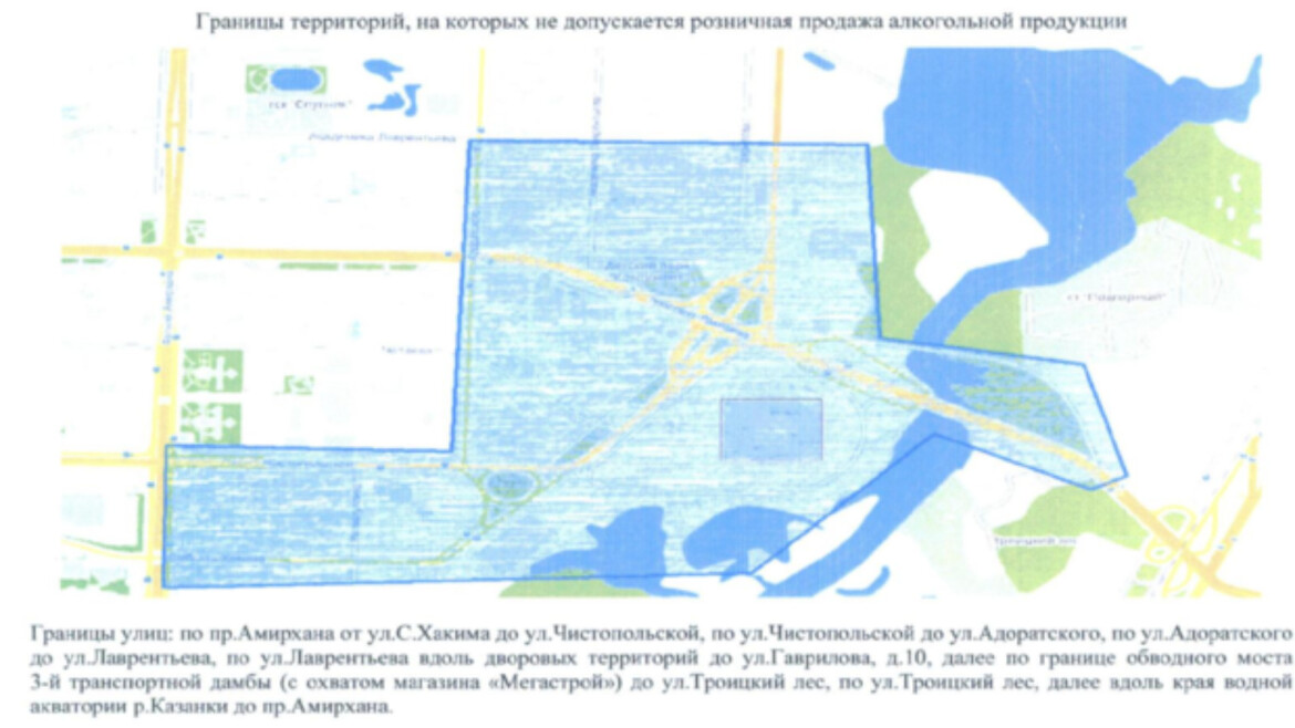 В зону ограничения вошли следующие участки улиц: по проспекту Амирхана, от ул. Сибгата Хакима до ул. Чистопольской, по ул. Чистопольской до ул. Адоратского, по ул. Адоратского до ул. Лаврентьева, по ул. Лаврентьева вдоль дворовых территорий до ул. Гаврилова, 10, далее по границе обводного моста третьей транспортной дамбы до ул. Троицкий Лес, а затем вдоль края водной акватории Казанки до проспекта Амирхана.