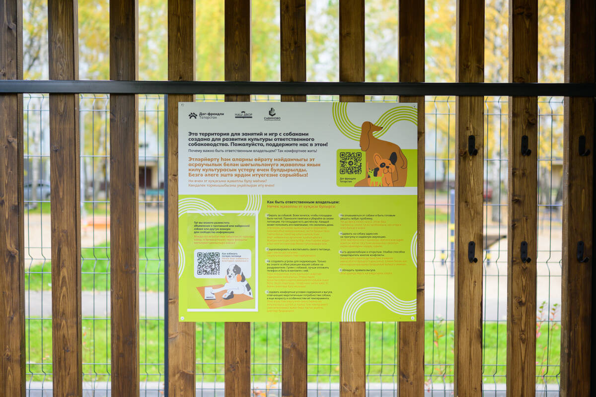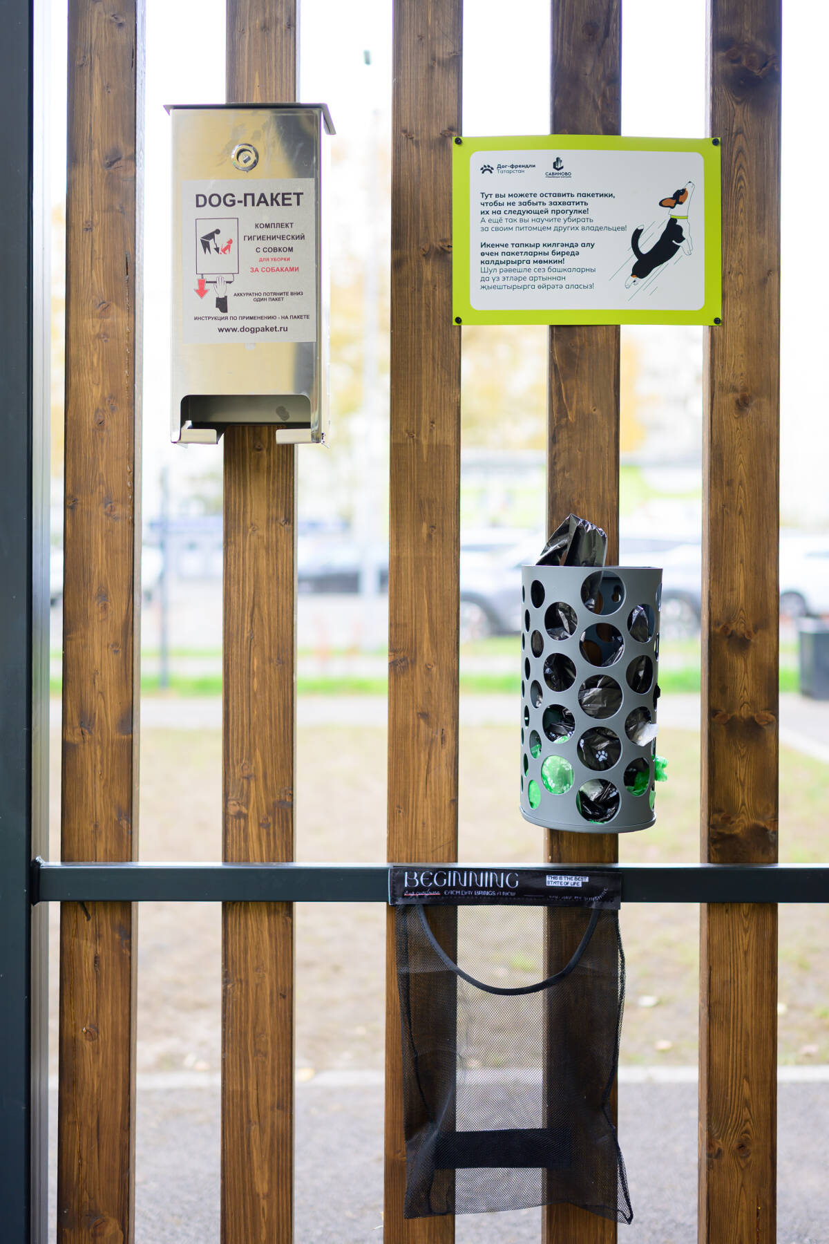 Площадка предназначена для коротких прогулок, игр и общения с питомцами. Здесь установлены навес, скамейки, крючки для личных вещей, а также диспенсеры для пакетов, которые жители наполняют самостоятельно. Такое решение, по словам архитекторов, помогает формировать культуру ответственности за общее пространство.