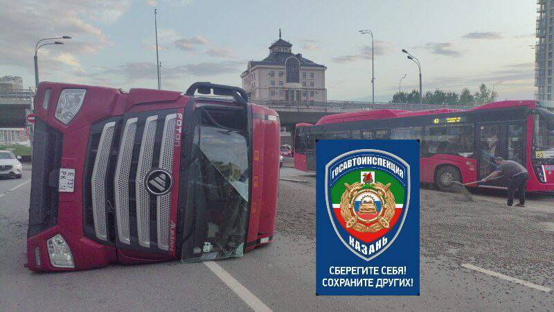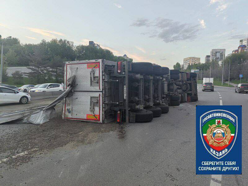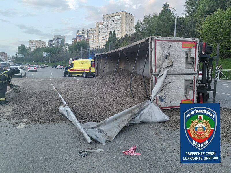 В Казани грузовик упал на бок и рассыпал груз на дорогу, водитель в больнице