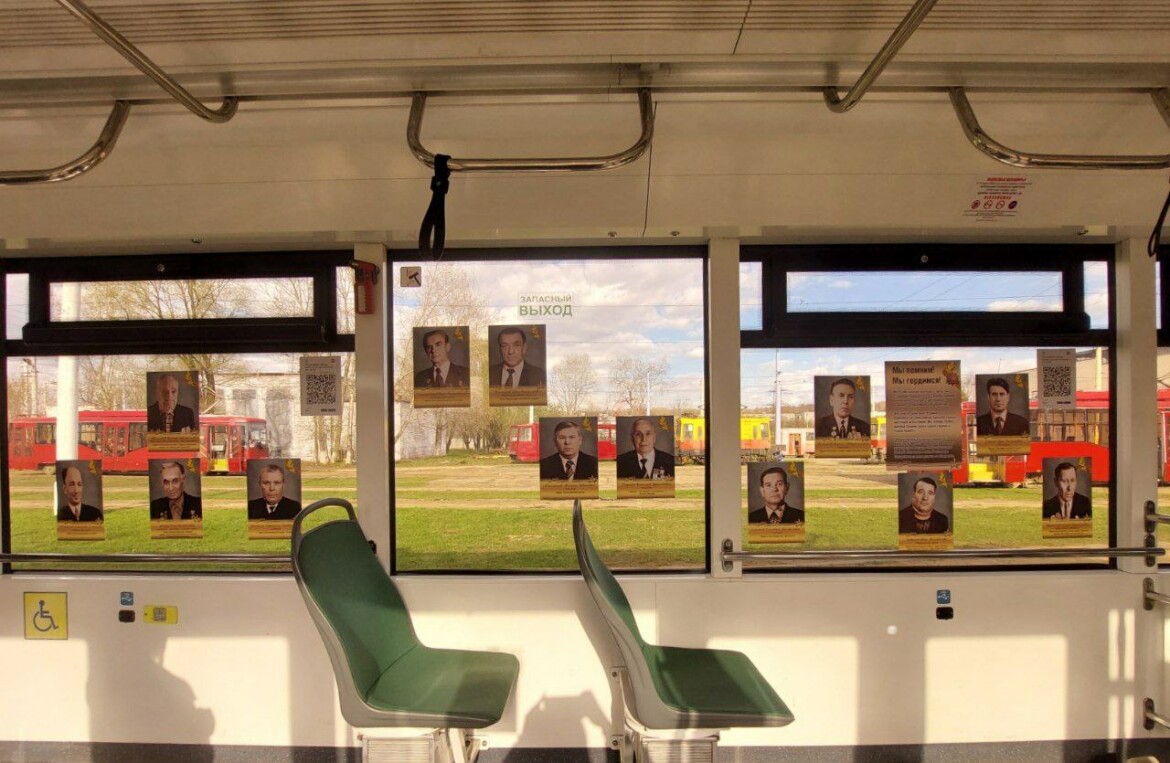 В салоне трамвая можно увидеть портреты ветеранов войны, которые являлись сотрудниками МУП. «Все они отдали долг Родине, боролись за свои семьи, прошли самые жестокие испытания. Мы хотим, чтобы жители Казани знали своих героев и чтили память», — говорится в Telegram-канале «Метроэлектротранса».
