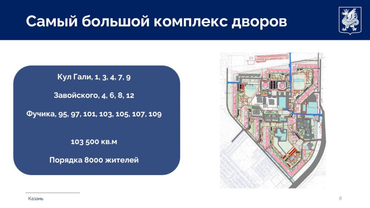Особое внимание уделят благоустройству 15 домов на улицах Кул Гали, Завойского и Фучика, где проживают более 8 тыс. человек. Общая площадь этой территории составляет 103,5 тыс. кв. метров.