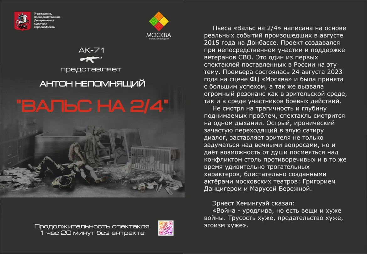 По словам организаторов мероприятия, пьеса «Вальс на 2/4» написана Антоном Непомнящим по мотивам событий, случившихся в августе 2015 года в Донбассе. Проект реализован при непосредственном участии и поддержке ветеранов спецоперации (это один из первых спектаклей, поставленных в России на эту тему).