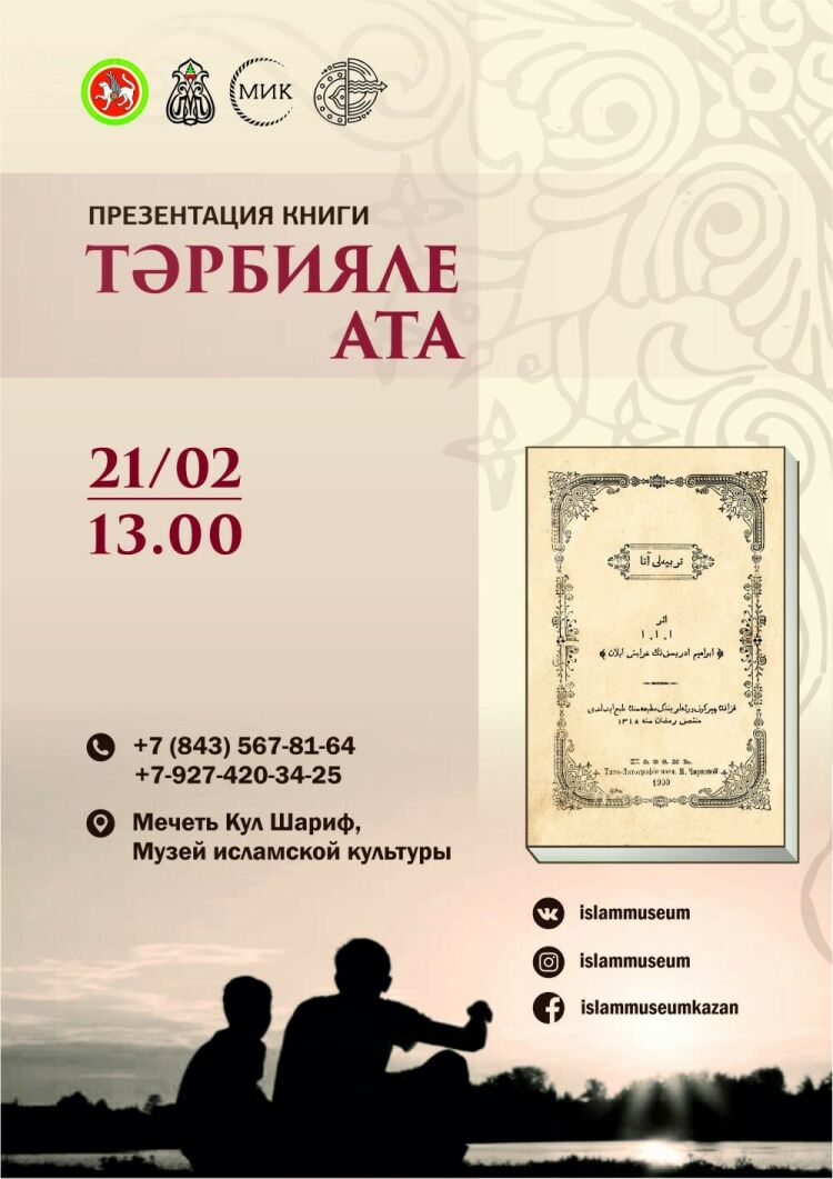 (Казань, 19 февраля, «Татар-информ»). 21 февраля в преддверии Дня защитника Отечества в Музее исламской культуры состоится презентация переиздания книги «Тэрбияле ата» («Благонравный отец») поэта Ибрагима Идрисова. Об этом сообщает пресс-служба музея.