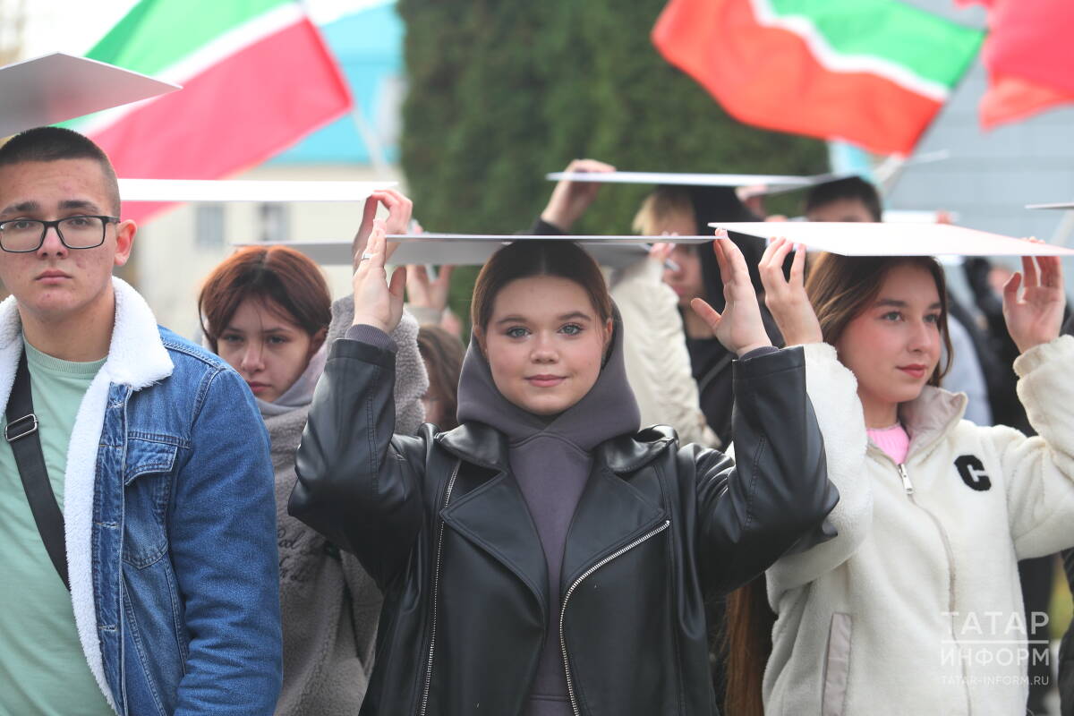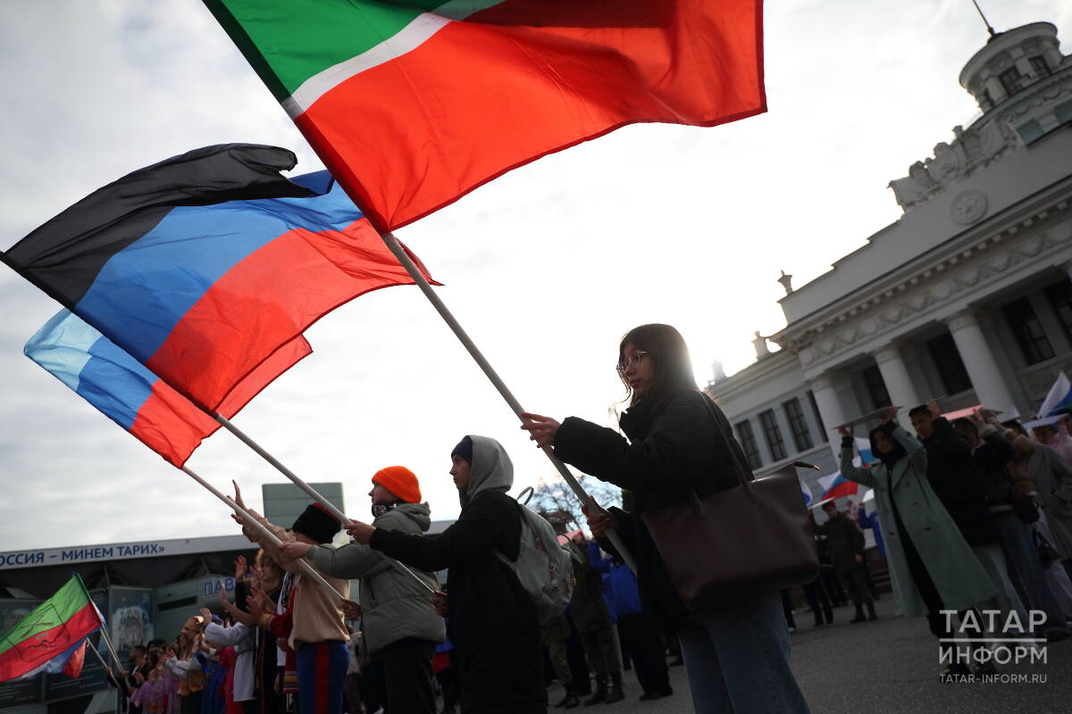 Более 200 человек выстроились в слово «Единство», держа в руках таблички в цветах российского триколора. Также участники развернули флаги России и Татарстана.