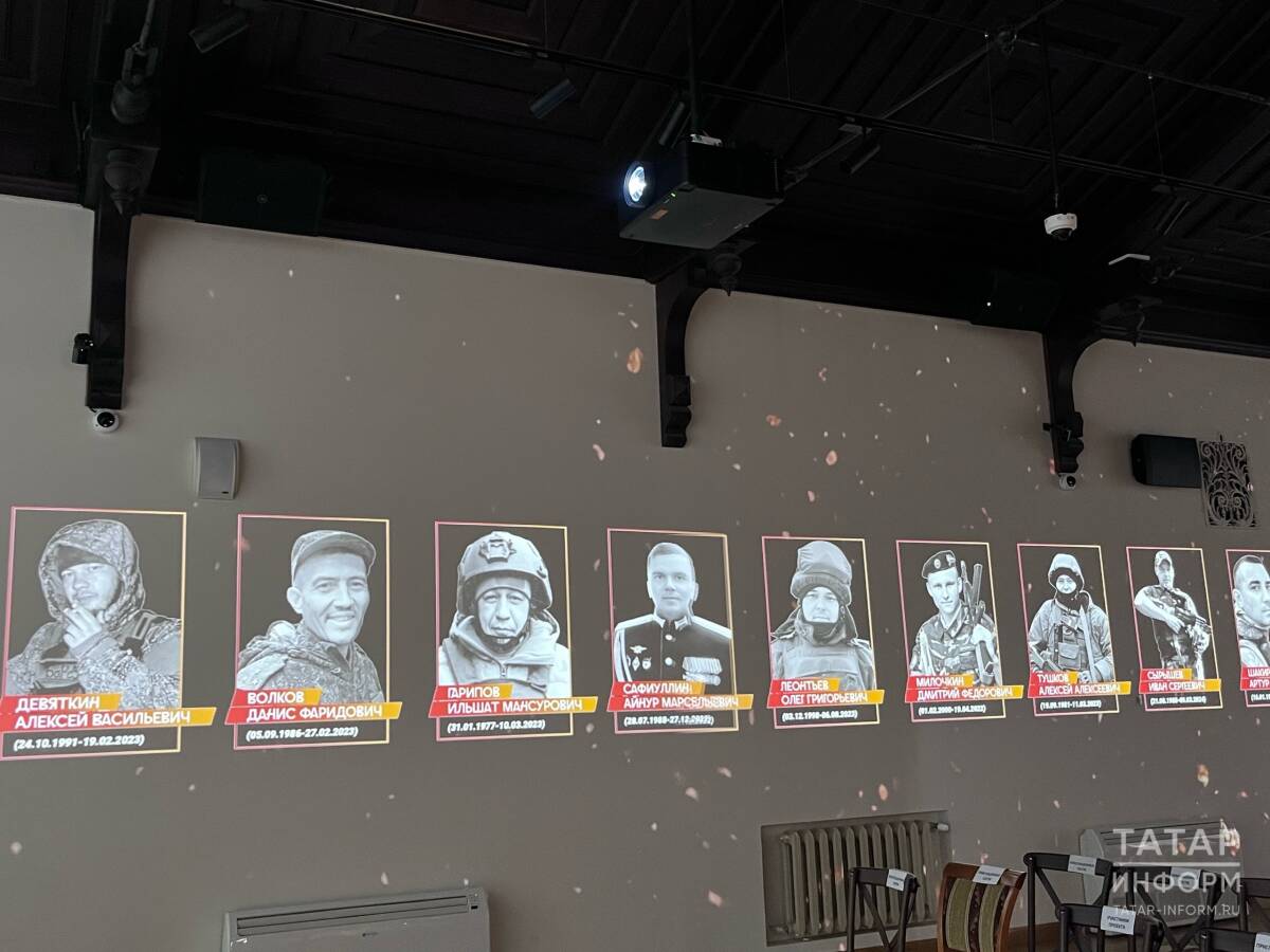 Выставочный зал включал в себя и мемориал в память о некоторых погибших героях России. Их фото изображены в виде интерактивной инсталляции на темном фоне с искрами пламени.