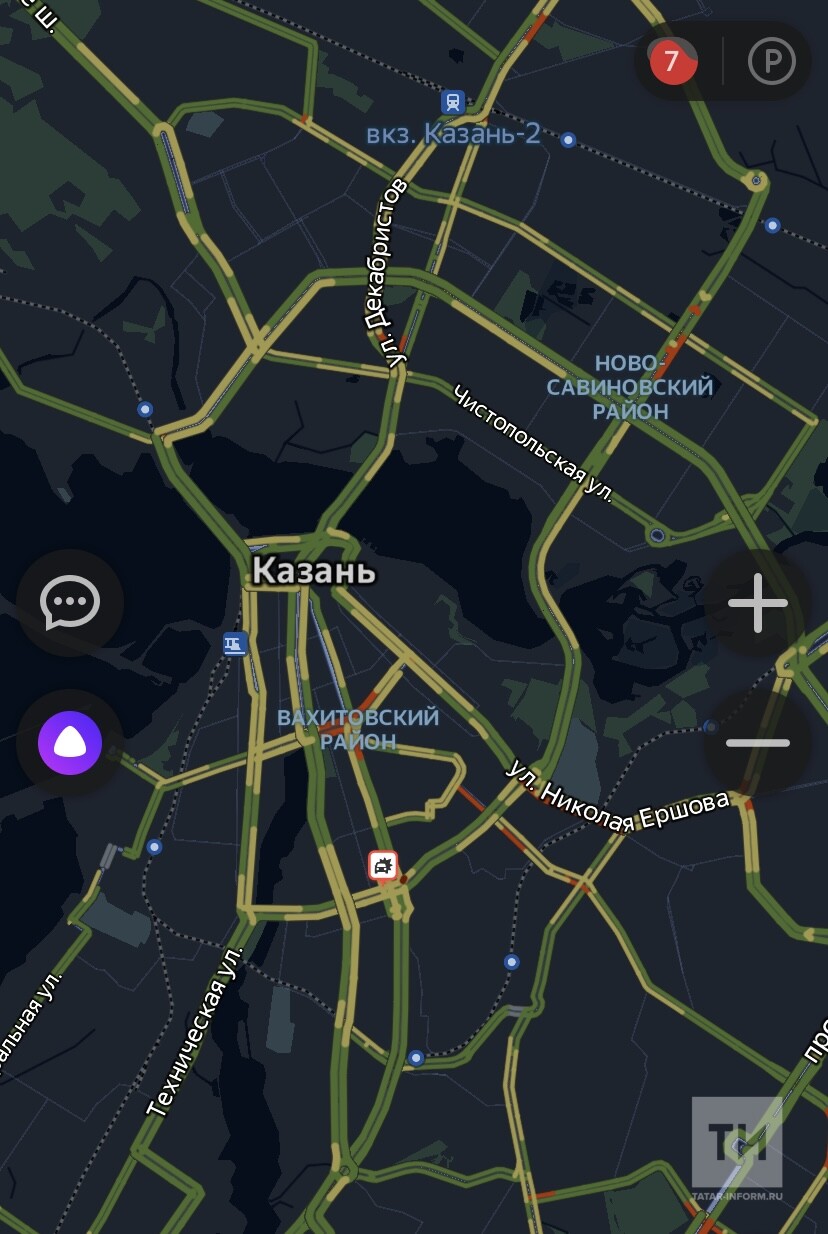 Красным горят центральные улицы Казани, а также Аделя Кутуя, Ершова и Гвардейская.