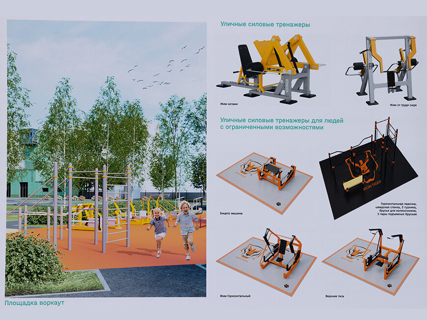 На площадке разместят воркаут-тренажеры, в том числе силовые — рукоходы, брусья, кольца, шведская стенка, скалодром, канатный комплекс и другие. Для детей-инвалидов установят бицепс-машину, тренажер верхней тяги, горизонтальную лавочку, шведскую стенку, турники и брусья для колясочников, а также две пары подъемных брусьев. На тренажерах дети с особенностями здоровья смогут упражняться в жиме ногами, в положении сидя от груди и горизонтальном жиме.