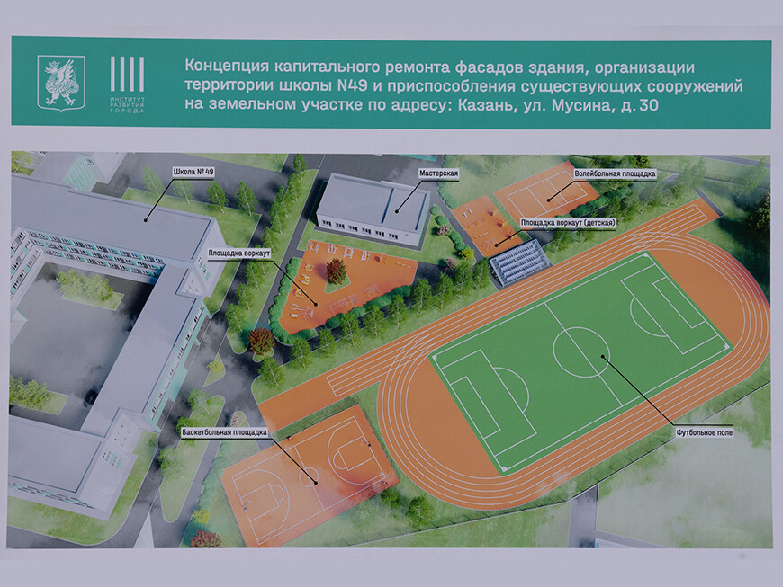 Комплекс разместится во дворе школы на площадке примерно в 6 тыс. кв. метров. После окончательного согласования начнутся собственно строительные работы. Здесь разместятся футбольное поле размером 30 на 60 метров с трибунами на 100 мест, баскетбольное поле размером 28 на 154 метра и волейбольное поле размером 18 на 9 метров, а также проложат беговые дорожки площадью 1649 кв. метров, рассказал директор школы №49 Дмитрий Садетдинов.