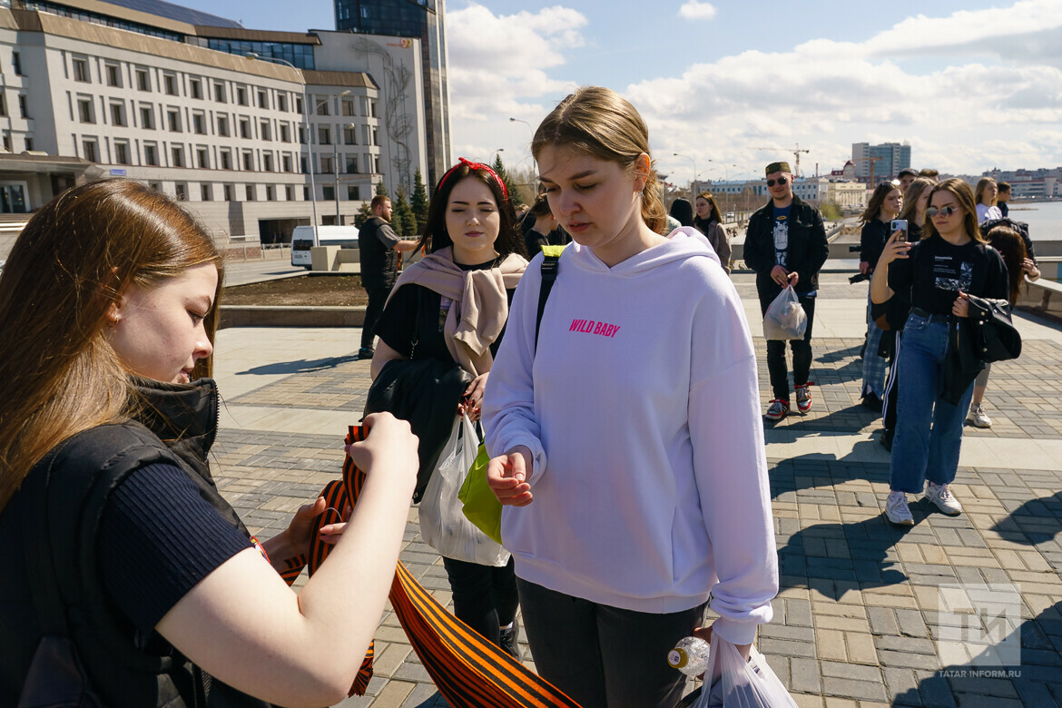 Казань присоединилась к ежегодной всероссийской акции «Георгиевская ленточка». Символ памяти активисты движения «Волонтеры Победы» начали раздавать у театра имени Г. Камала.