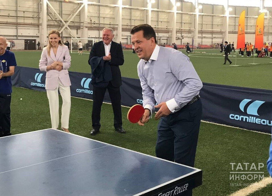 После официальной части, которую завершили поднятием флага РФ и РТ, фитнес-инструктор Ольга Кожевникова провела для ветеранов разминку. Мэр Казани вместе с приглашенными гостями отправился к ветеранам и сыграл несколько партий в настольный теннис в паре с ветеранами и Светланой Деминой.