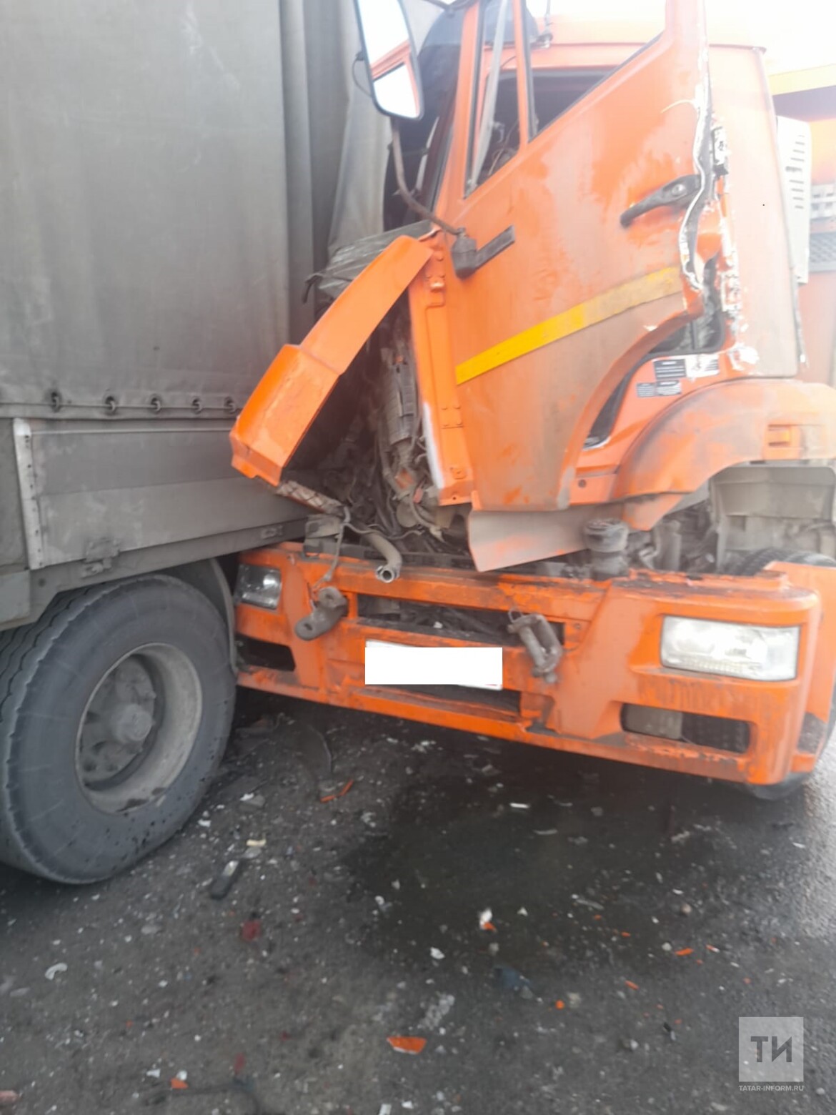 В результате столкновения кабину одного из большегрузов сильно помяло.