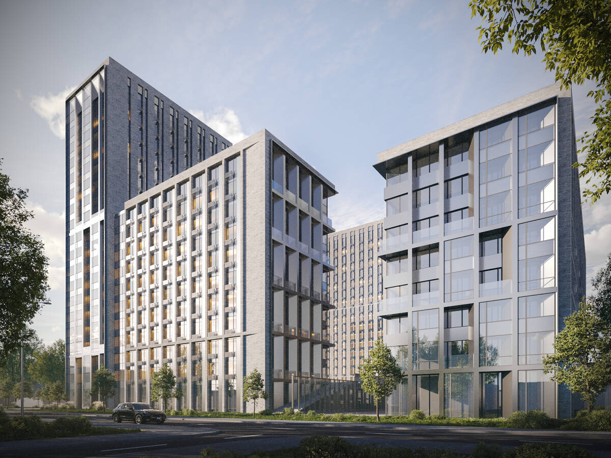 В архитектуре проекта монументальность сочетается с динамикой за счет объемных решений и совершенно разных приемов, использованных на фасадах. В зависимости от стороны света фасады отличаются микромассингом, разной глубиной и модульностью. Обращенные к югу, они становятся более глубокими по сравнению с северной частью проекта за счет балконов. Чередование фактур, ниш и выступов задает определенный ритм зданиям. Горизонтальное членение фасадов делит объем не только высотных доминант, но и среднеэтажных корпусов, визуально подчеркивая модульность зданий и словно меняя их масштаб в зависимости от расстояния, на котором просматривается квартал.