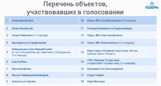 В список претендентов вошли территории, которые у всех на слуху: 3-я очередь набережной озера Кабан, парки в жилых комплексах «Салават Купере», «Светлая Долина», также в перечень был включен бульвар по улице Волгоградская, Ноксинский лес и другие объекты.