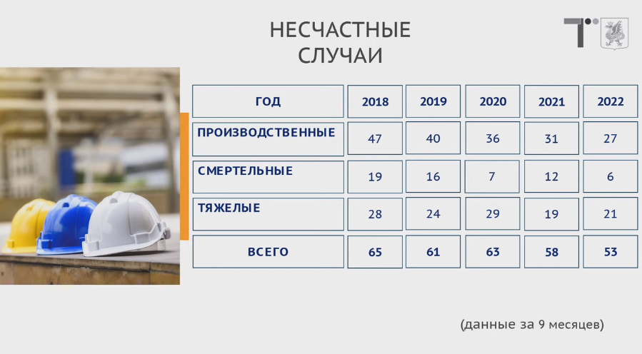 За девять месяцев этого года в исполком Казани поступило 53 уведомления о несчастных случаях производственного травматизма, это на 9% меньше, чем за аналогичный период прошлого года. Количество смертей за девять месяцев сократилось вдвое — с 12 до шести по сравнению с аналогичным периодом прошлого года. Об этом на деловом понедельнике сообщил заместитель руководителя исполкома Ильдар Шакиров.