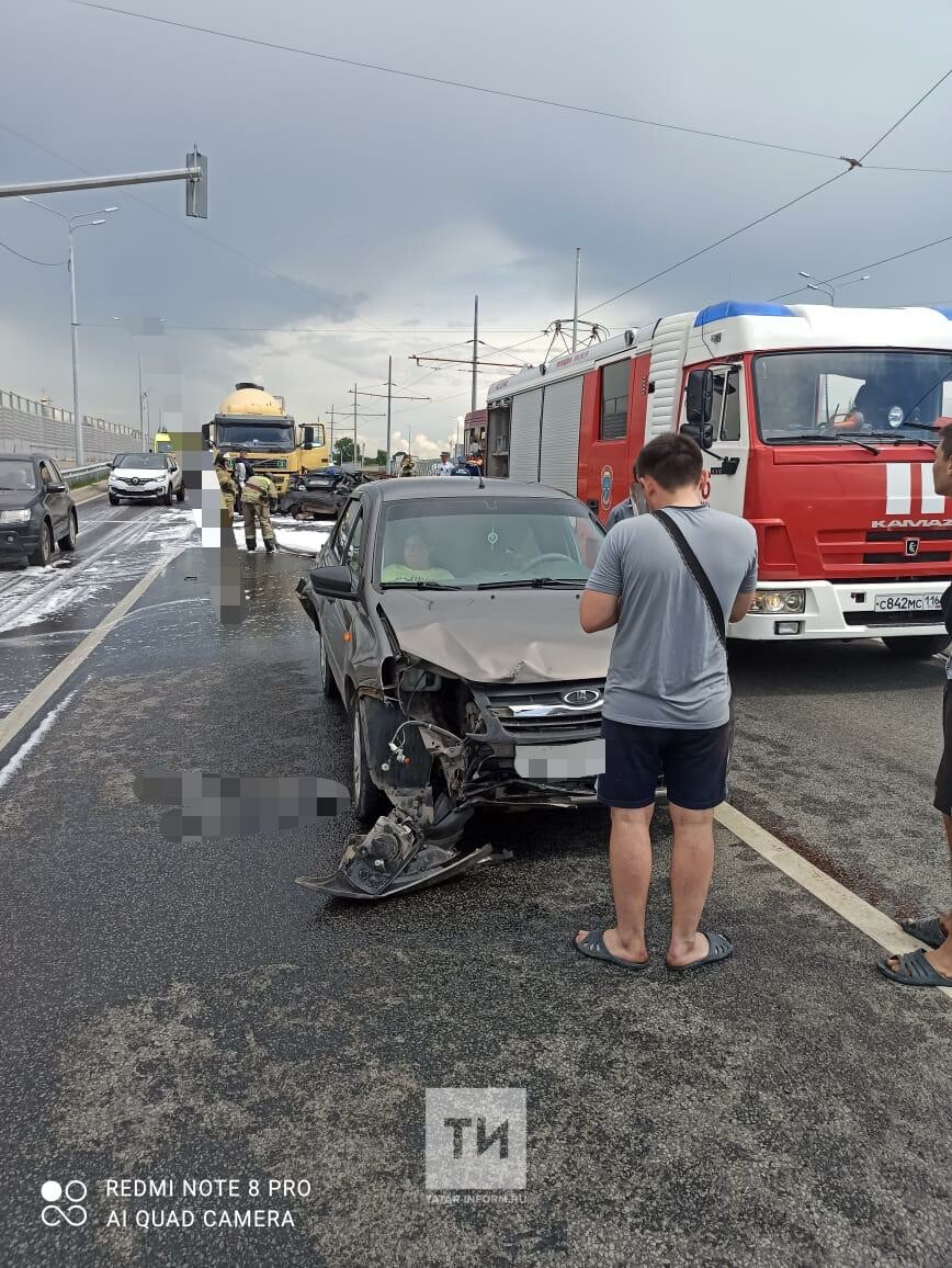 Как стало известно ИА «Татар-информ» со слов очевидцев, водитель бетономешалки отвлекся от дороги и протаранил сразу автомобили, которые остановились на светофоре.
