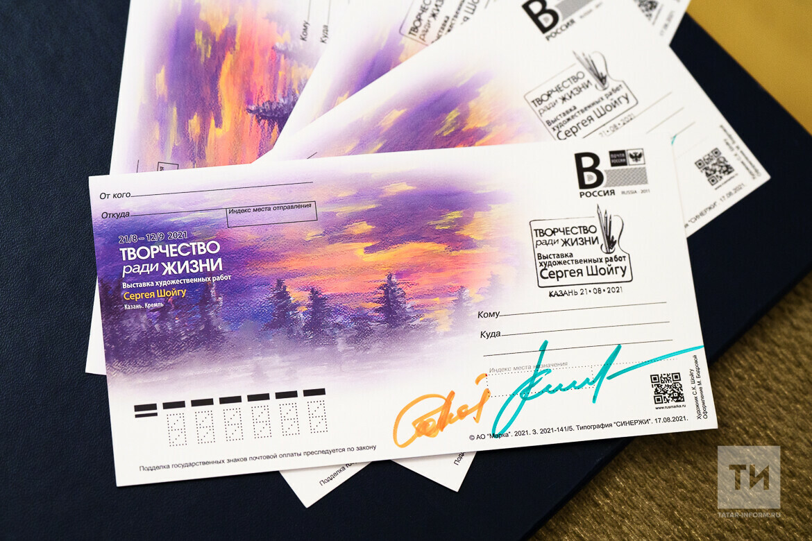 На мероприятии также состоялось памятное гашение маркированной почтовой карточки, иллюстрированной картиной Сергея Шойгу. Она выпущена тиражом 10 тыс. экземпляров специально к выставке. Карточки уже поступили в почтовые отделения.