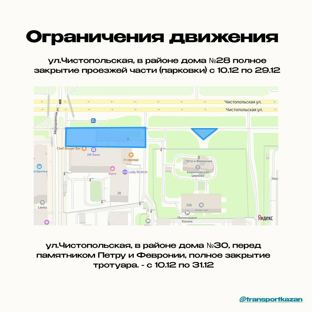 Кроме того, с 10 по 31 декабря полностью перекроют тротуар на Чистопольской у дома №30.