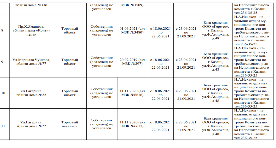 В Казани опубликован список, в который вошли 11 незаконно установленных торговых объектов. Информация об этом размещена в сборнике документов мэрии за 17 июня.