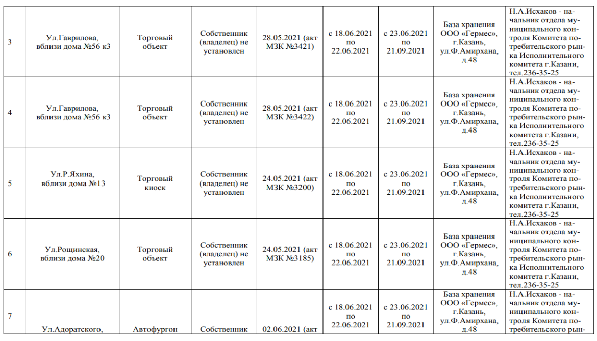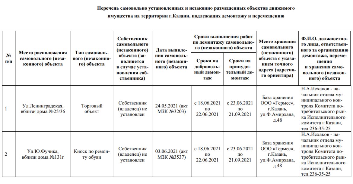 «Утвердить перечень самовольно установленных и незаконно размещенных объектов движимого имущества на территории Казани, подлежащих демонтажу и перемещению», — сообщается в документах.