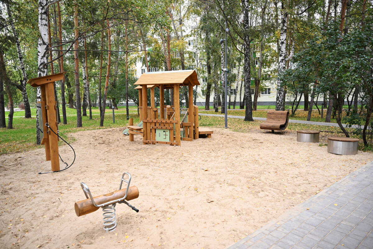 Детская площадка состоит из игрового комплекса, уличных музыкальных инструментов, качелей, качалок, а также там есть игровой экскаватор и песочница.