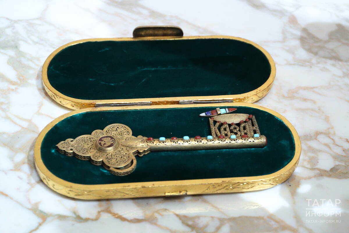 На витрине представлено ювелирное произведение искусства Равката Мухаметшина – символический серебряный с позолотой и инкрустацией драгоценными камнями ключ от Казани. Хранится он в специально созданном для него футляре с бархатной обивкой. Известный ювелир-реставратор изготовил этот ключ специально к 1000-летию Казани.