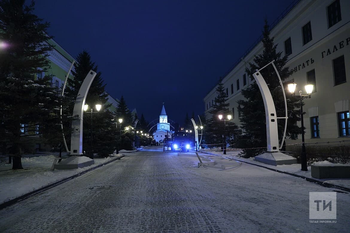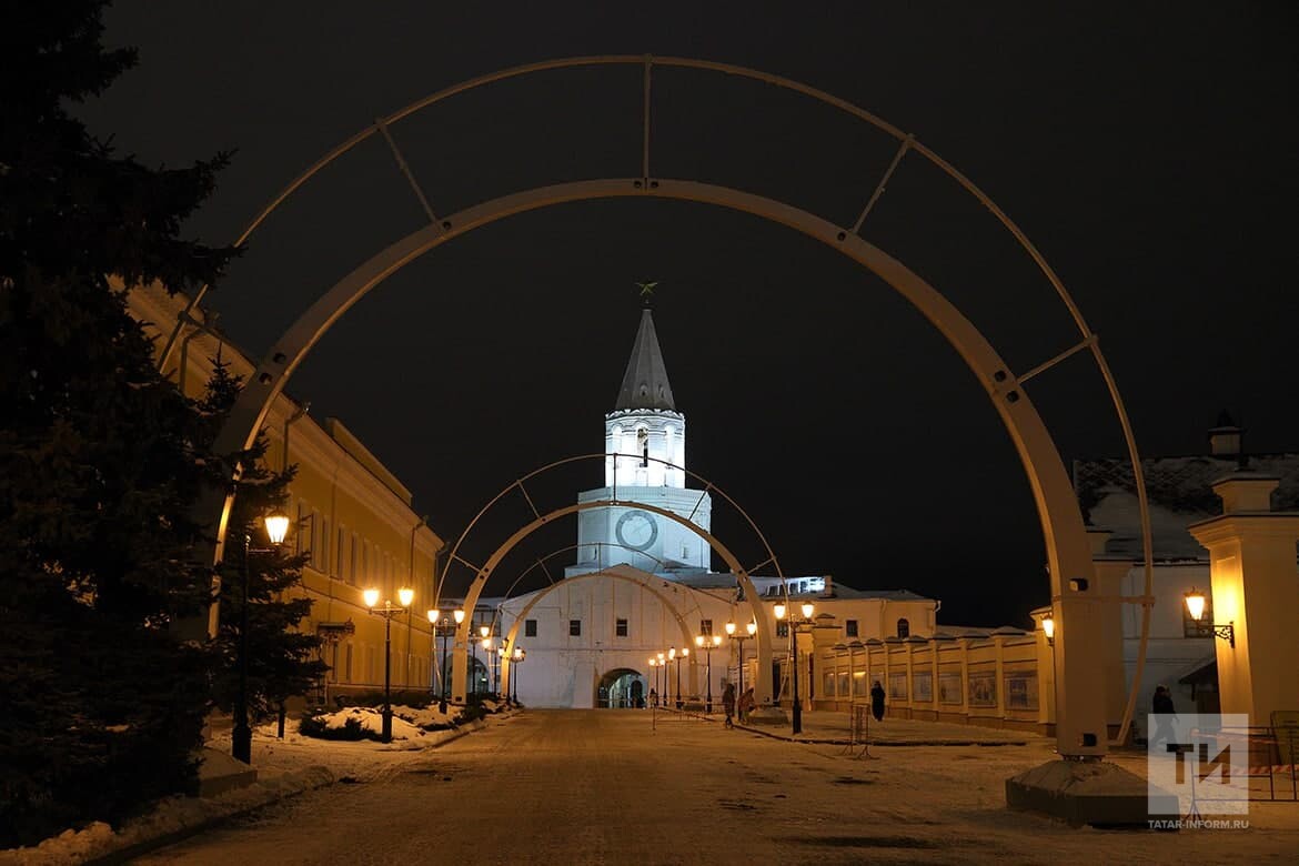 На территории Казанского Кремля начали монтаж конструкций новогодней иллюминации. Рабочие установили первые арки над проездом между зданием Юнкерского училища и Присутственных мест.