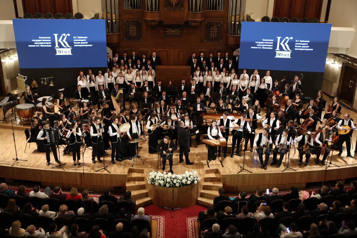 Торжественный вечер, посвященный юбилейному 80-летию Казанской государственной консерватории им. Н.Г. Жиганова прошел сегодня в концертном зале им. Сайдашева. На сцене с поздравительными словами выступили Раис РТ Рустам Минниханов, министр культуры России Ольга Любимова и ректор Казанской консерватории Вадим Дулат-Алеев.