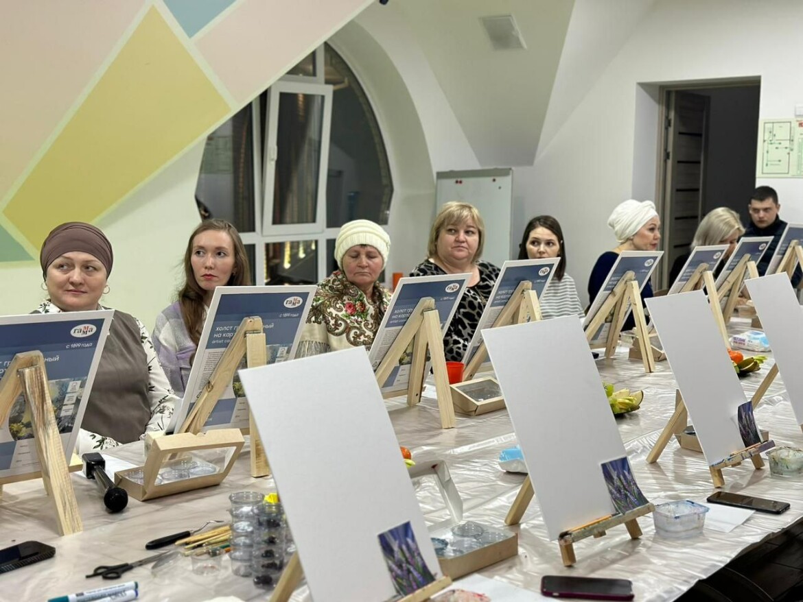 В Кукморском районе большую поддержку оказывают семьям военных. Например, в центре духовного воспитания «Хидаят» для матерей и жен бойцов организовали арт-терапию, где они изображают на холстах красивые цветы.