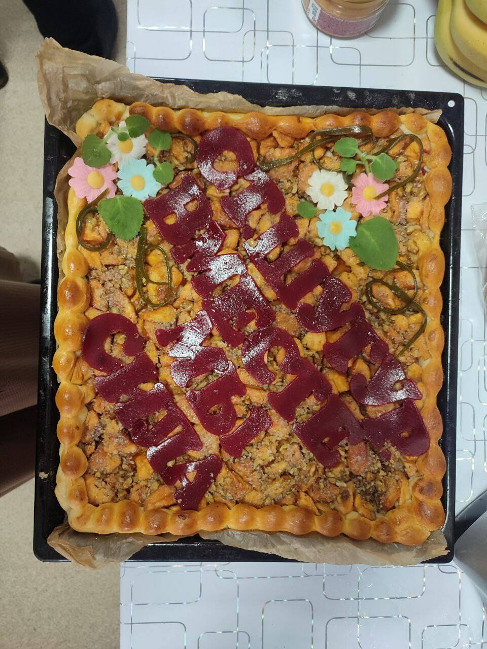 С каждой отправкой гумпомощи бойцы получают и домашние пироги, приготовленные Зульфией Мирзаевой. В Старое Шугурово она тоже приехала не с пустыми руками: на очередном пироге красуется надпись «Старое Шугурово – вместе мы сила».