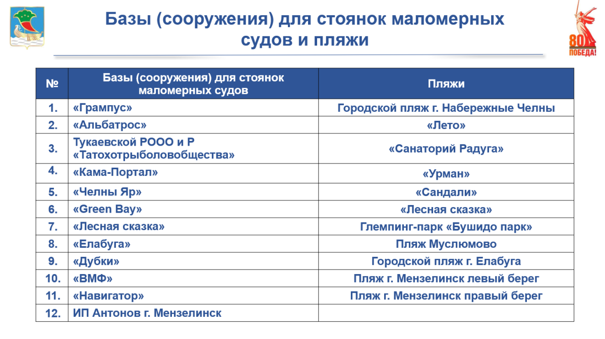 В 2025 году в зоне ответственности Набережночелнинского инспекторского отделения ГИМС задекларированы 12 баз для стоянок маломерных судов и 11 пляжей, из которых пять расположены в самих Набережных Челнах. Все официальные пляжи оборудованы общественными спасательными постами с дежурными обученными спасателями. Об этом на аппаратном совещании рассказал руководитель Набережночелнинского инспекторского отделения Центра ГИМС Главного управления МЧС России по Республике Татарстан Абузар Нугуманов.