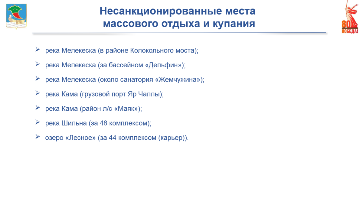 На территории города также выявлены семь несанкционированных мест массового отдыха у воды, представляющих повышенную опасность. В связи с этим администрациям районов города даны рекомендации установить запрещающие аншлаги, организовать общественные посты, назначить ответственных лиц и многое другое.