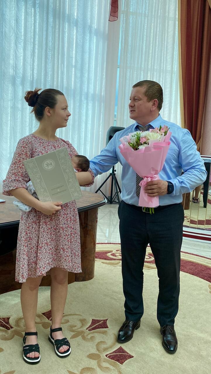 Исполняющий обязанности руководителя исполкома района Вадим Никитин поздравил молодых родителей с рождением дочери, вручил молодой маме свидетельство о рождении маленькой Мелиссы, вручили цветы и подарок.