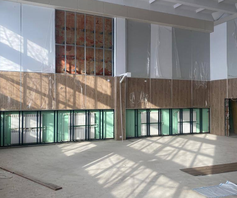 В спортивном зале приступили к монтажу настенных панелей. Сегодня полностью завершился монтаж сантехники, в санузлах начали укладывать плитку, идут работы по фасаду, уже появились отделочные панели.