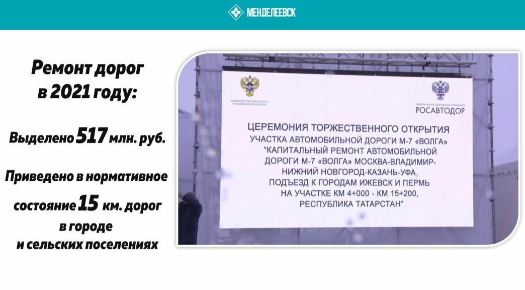 В 2021 году Менделеевскому району выделено 520 млн рублей, за счет которых удалось привести в нормативное состояние более 15 км дорог в городе и сельских поселениях.