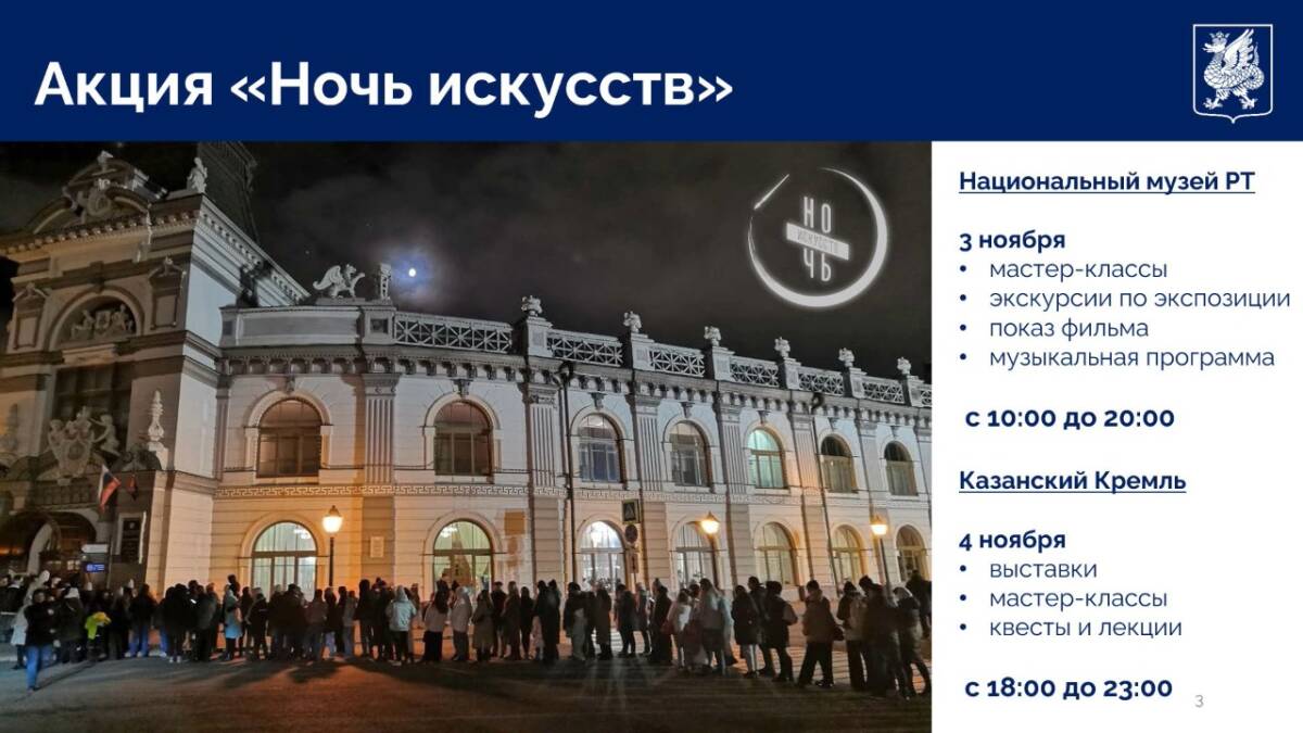 Так, 3 ноября в Национальном музее РТ пройдет акция «Ночь искусств» с мастер-классами, лекциями об истории народов, демонстрацией фильма «Соединяющий миры» о Каюме Насыри и выступлением этногруппы «Риваять».