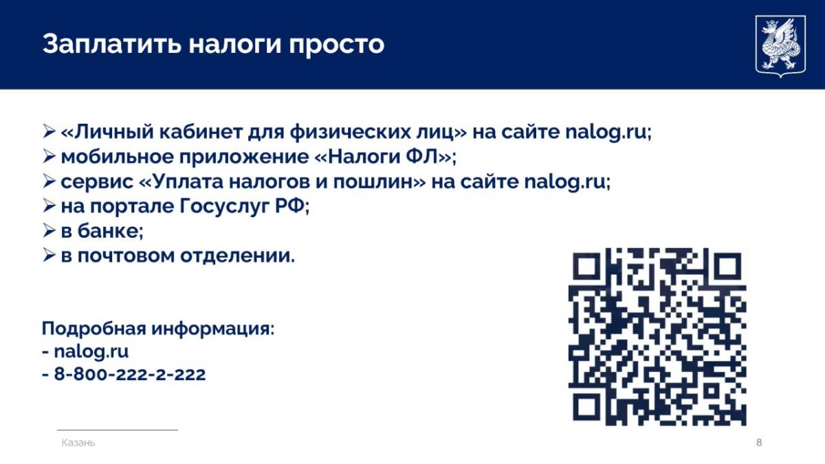 Заплатить налоги горожане могут в личном кабинете на официальном сайте ФНС России, через мобильное приложение «Налоги ФЛ» и через Единый портал государственных услуг. Также заплатить налоги можно через платежные терминалы, банки и почтовые отделения.